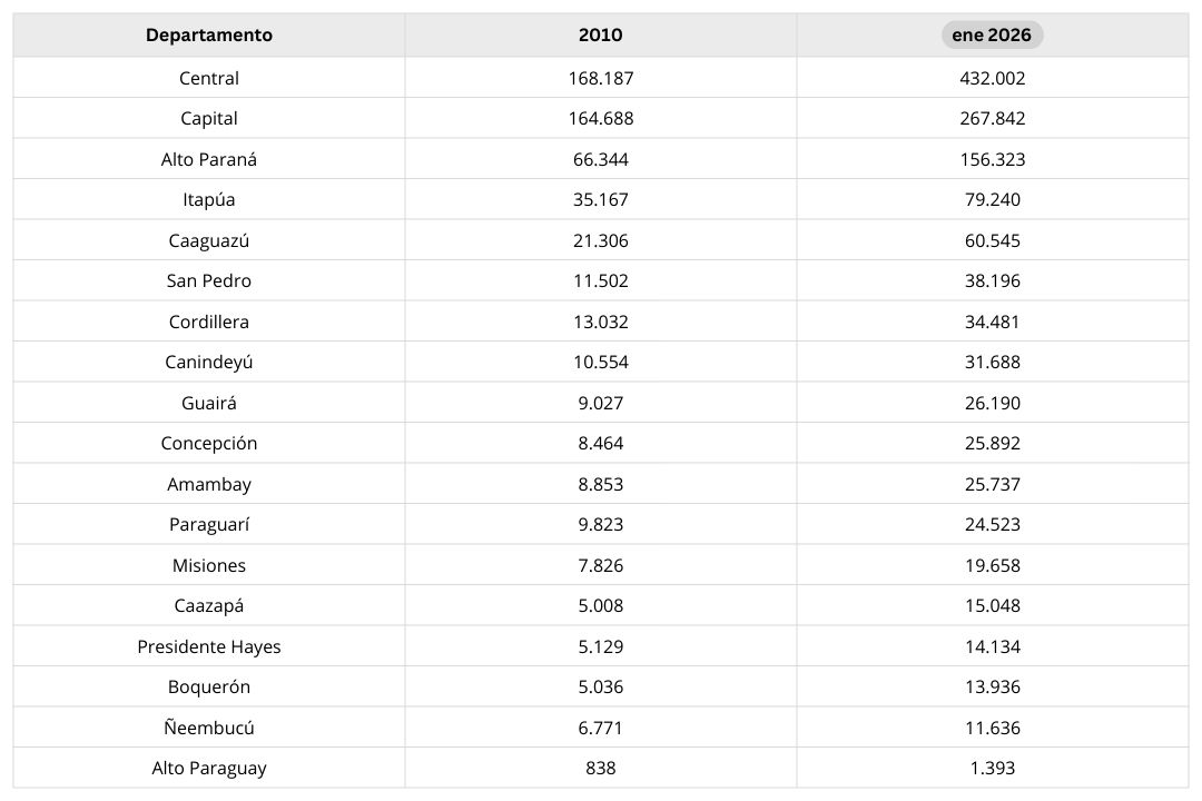 Paraguay cuenta con 1.278.487 contribuyentes registrados al 31 de enero de 2026. En 2010 el total era de 557.944. En 16 años el padrón aumentó en 720.543 registros. Los datos desagregados por departamento permiten observar la distribución territorial actual y su evolución histórica.