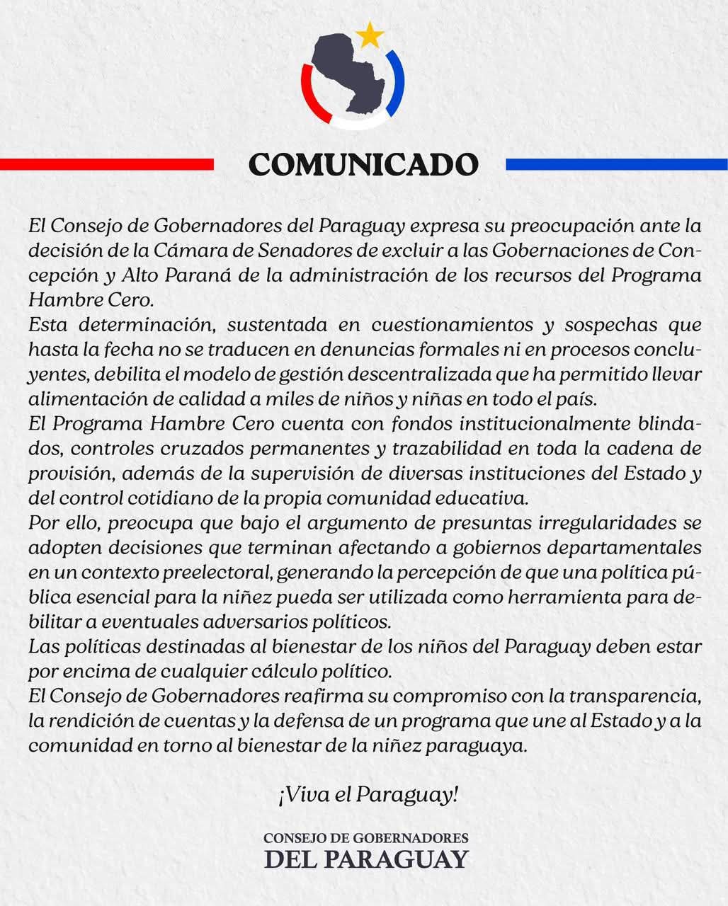 El Consejo de Gobernadores del Paraguay manifestó su preocupación por la decisión adoptada por la Cámara de Senadores de excluir a las gobernaciones de Concepción y Alto Paraná de la administración de los recursos del programa Hambre Cero, una política central de alimentación escolar impulsada por el Gobierno nacional. Los gobernadores sostienen que la determinación se apoya en cuestionamientos que, hasta ahora, no derivaron en denuncias formales ni en procesos administrativos o judiciales concluidos.