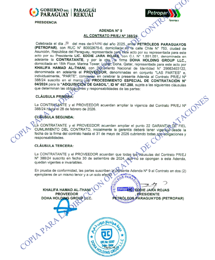 Adenda N.º 9 del contrato entre Petropar y la firma qatarí Doha Holding Group, publicada por la DNCP