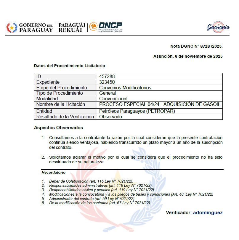El expediente incluye reparos técnicos y observaciones de la DNCP, que cuestionan la continuidad del acuerdo y la justificación económica presentada por Petropar. La petrolera estatal no había publicado los documentos hasta esta semana, pese a tratarse de un contrato millonario con reiteradas ampliaciones.
