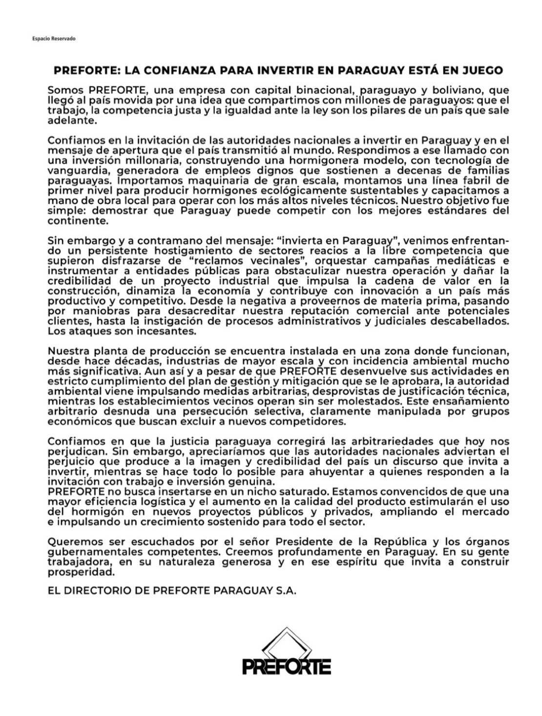 El comunicado concluye recordando que Preforte cree “profundamente en Paraguay, en su gente trabajadora y en su espíritu generoso que invita a construir prosperidad”.