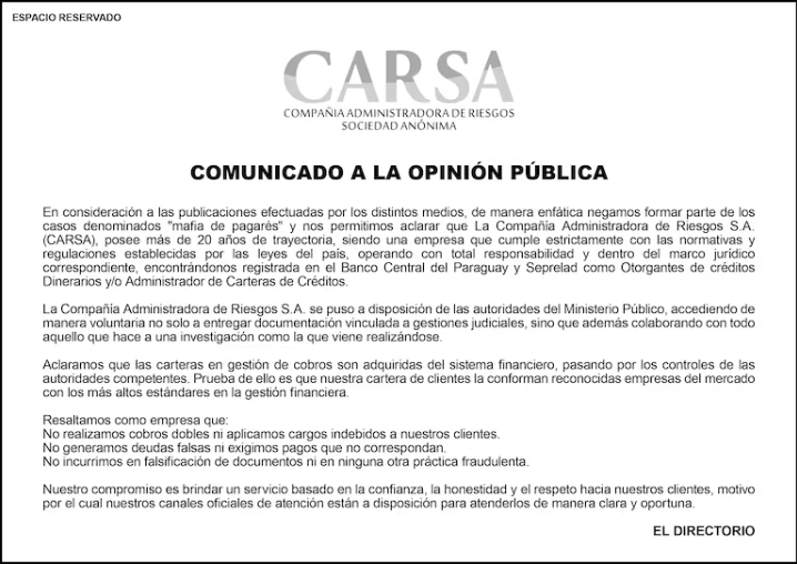 Comunicado de CARSA, publicado en marzo de 2025 en el marco del caso pagarés