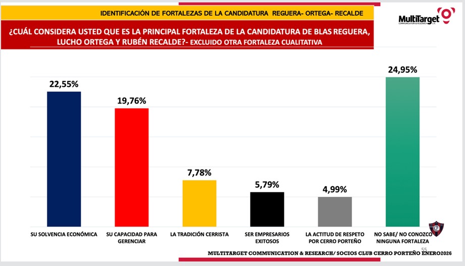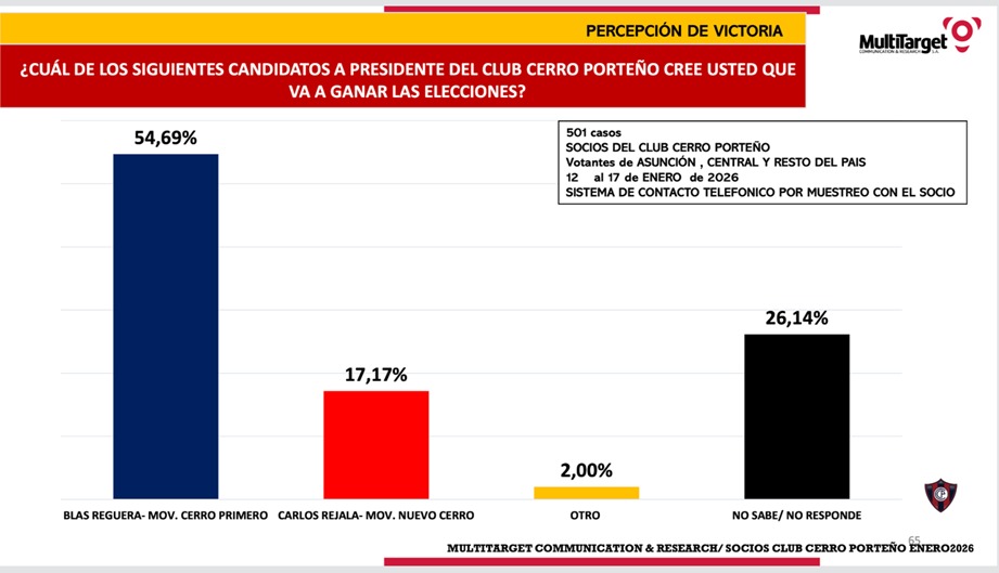 El clima electoral en Cerro Porteño ya no se mueve en el terreno de la especulación. Los números comienzan a ordenarse y, con ellos, las percepciones. A mediados de esta semana se entregó un nuevo sondeo de la consultora Multitarget que vuelve a colocar a Blas Reguera con una ventaja amplia y sostenida frente a su principal contendiente, Carlos Rejala. No es un dato aislado: se suma a una serie de mediciones previas que, desde noviembre, muestran una misma dirección.