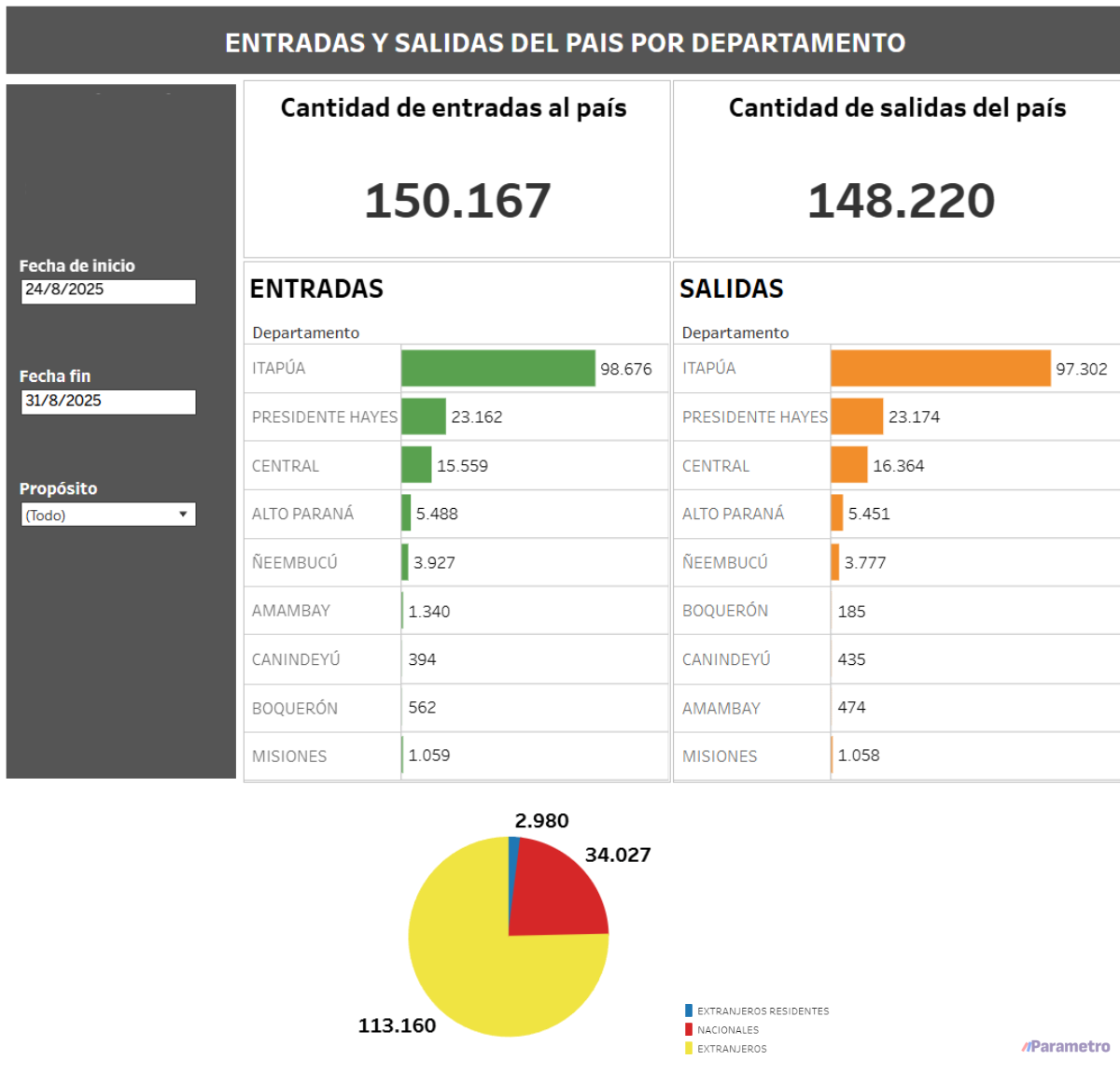 El análisis semanal permite observar con mayor precisión lo ocurrido durante el Rally. Entre el 24 y el 31 de agosto ingresaron al país 150.167 personas, de las cuales 113.160 fueron extranjeras. Itapúa concentró la mayoría con 98.676 ingresos, es decir, más del 65% del total nacional de esa semana.