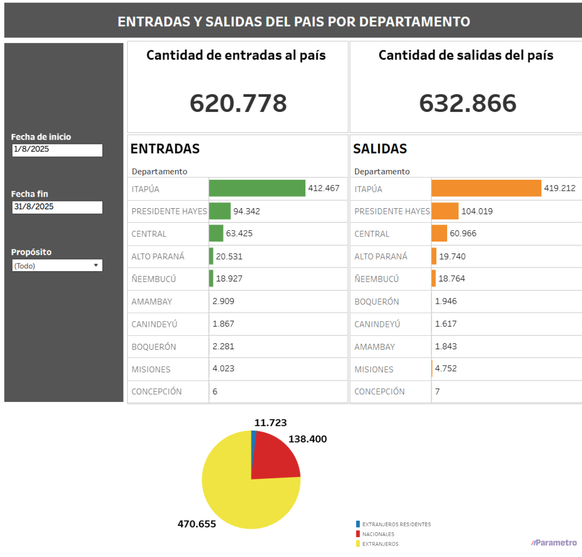 Los datos oficiales de la Dirección General de Migraciones, actualizados hasta el 31 de agosto de 2025, muestran que en ese mes ingresaron al país 620.778 personas, mientras que salieron 632.866. Del total de entradas, 470.655 fueron extranjeros, lo que refleja un flujo fronterizo elevado en coincidencia con la realización de los Juegos Panamericanos Junior en Asunción (9 al 23 de agosto) y el Mundial de Rally en Itapúa (28 al 31 de agosto).