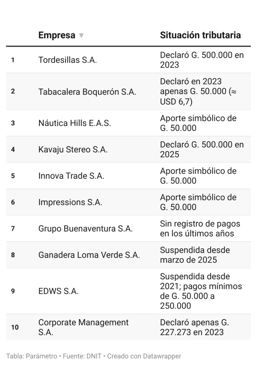 Este medio accedió a un documento de la Dirección Nacional de Ingresos Tributarios (DNIT) que expone un escenario llamativo. Mientras empresas como Plaza Asunción S.A. o Fénix Emprendimientos S.A. declaran montos millonarios en impuestos, otras aparecen suspendidas, sin registros de pago o con cifras tan bajas que resultan simbólicas. Grupo Buenaventura S.A. no registra aportes en los últimos años; Ganadera Loma Verde S.A. figura suspendida desde marzo de 2025; y Tabacalera Boquerón S.A., un negocio histórico de la familia Domínguez, declaró en 2023 apenas G. 50.000, una suma irrisoria que refuerza la percepción y enormes dudas de que hoy sea prácticamente un cascarón vacío.
