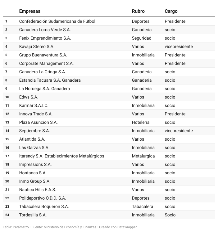 Alejandro Domínguez ha construido en Paraguay una red de 24 empresas que atraviesa sectores estratégicos como la hotelería, la ganadería, la metalurgica y el negocio inmobiliario. Ese poder, consolidado a partir de 2016 con su ascenso a la presidencia de la Conmebol, parece incuestionable. Pero los datos tributarios muestran otra cara de ese entramado: varias de sus compañías operan en papeles, sin actividad aparente o con aportes mínimos al fisco, lo que deja la sospecha de que se trata de estructuras fantasmas más que de negocios reales. La existencia de estas sociedades deja dudas sobre si son efectivamente negocios y cuál sería su función.