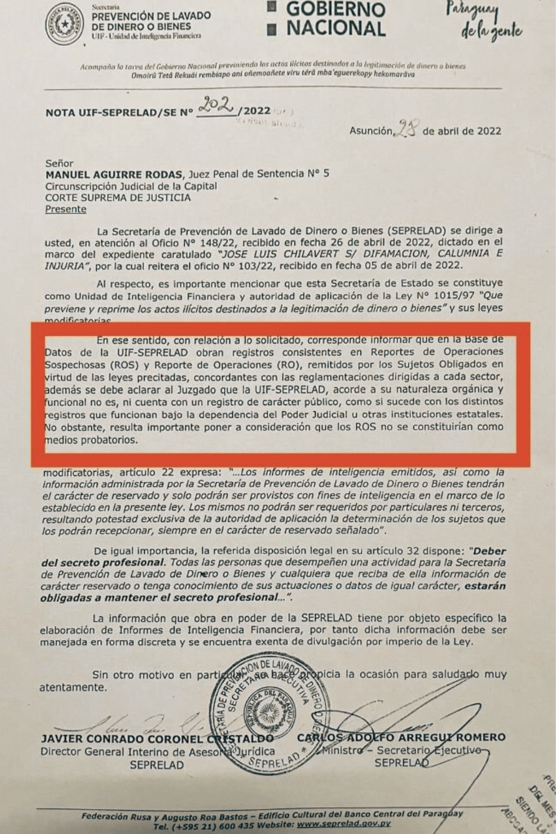 ROS de Domínguez: SEPRELAD lo admitió ante la Justicia
