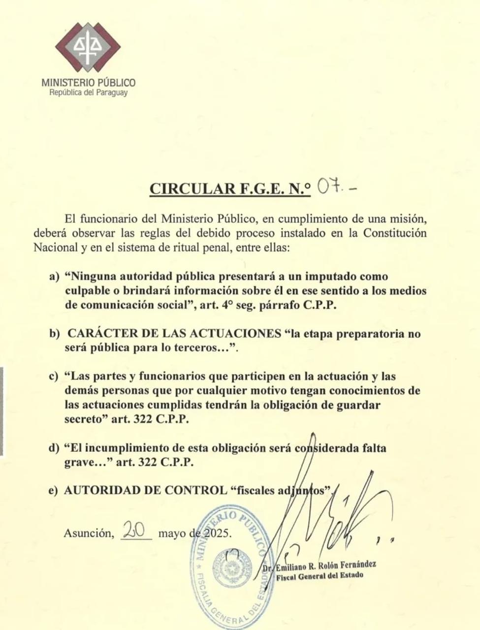 Como contexto institucional, cabe recordar que el Fiscal General Emiliano Rolón emitió el 20 de mayo de 2025 una circular interna que prohíbe expresamente a los fiscales presentar como culpable a un imputado antes de una sentencia firme y advierte que esa práctica constituye falta grave.