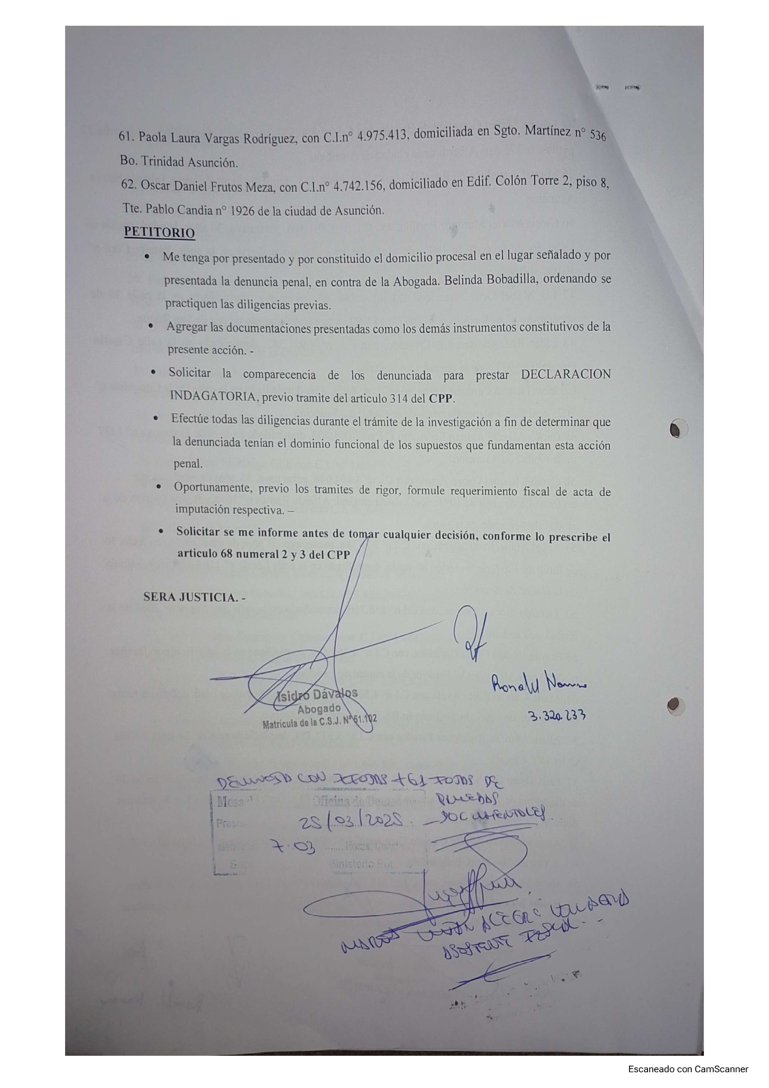 La denuncia contra Bobadilla fue presentada en marzo por Ronald Navarro, con patrocinio del abogado Isidro Dávalos. Le atribuye los hechos punibles de revelación de secretos de servicio, prevaricato y persecución de inocentes, entre otros. El escrito ofrece además una nómina de decenas de testigos, entre ellos funcionarios de la Fiscalía y abogados que intervinieron en el expediente, quienes podrían declarar sobre filtraciones y prejuzgamientos.