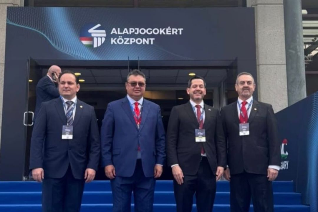El diputado Sebastián Remesowski, el embajador Gustavo Leite, el presidente de la Cámara de Diputados Raúl Latorre y el diputado Yamil Esgaib, durante la conferencia CPAC en Hungría.