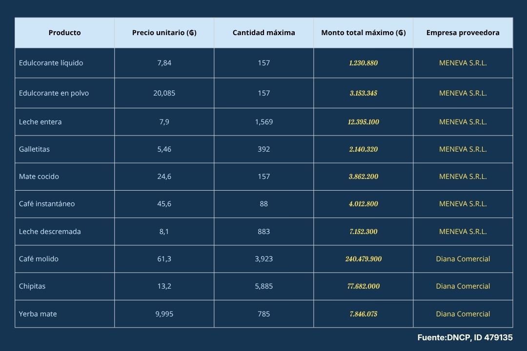 El pliego de bases y condiciones establece de forma detallada los productos a ser adquiridos, lo que permite reconstruir el tipo de consumo interno que sostiene la institución. La lista incluye café molido en paquetes de 500 gramos, café instantáneo 100% puro sin agregados, leche entera y descremada en envases tetra pack, yerba mate compuesta, mate cocido soluble, edulcorantes, galletitas y chipitas.