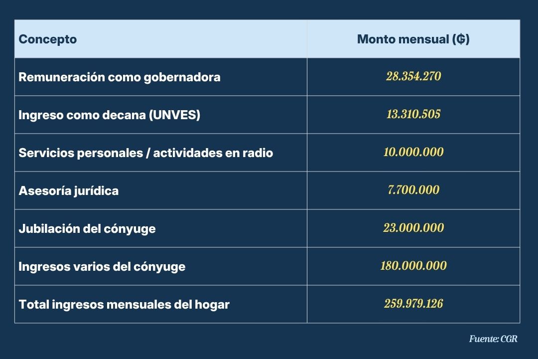 Para dimensionar el monto: un trabajador que percibe salario mínimo necesitaría acumular más de 100 salarios mensuales para alcanzar el ingreso del hogar de la gobernadora en un solo mes. En términos diarios, el hogar genera más de ₲ 8 millones por día.
