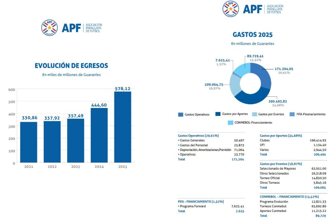 En 2025, la Asociación Paraguaya de Fútbol (APF) gastó ₲ 578.120 millones, según su balance. Ese nivel de egresos marca la escala económica de la institución y la dimensión del negocio que administra. En ese mismo periodo, la APF declaró un pago directo de ₲ 1.508.812.015 en IVA general, que constituye su principal aporte al fisco.