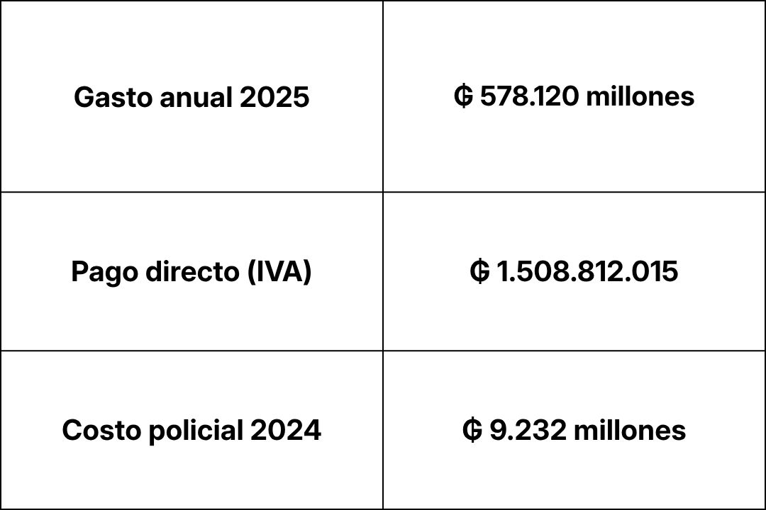 En paralelo, el Estado sostiene el funcionamiento del sistema. Durante 2024, la Policía Nacional movilizó 16.197 agentes en 34 partidos, con un costo estimado de ₲ 9.232 millones, financiado íntegramente con recursos públicos.