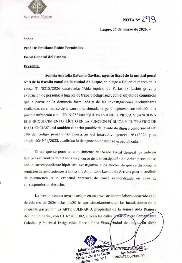 Un accidente laboral grave en Luque abrió una investigación que fue mucho más allá del hecho inicial. El caso se originó en la empresa Arte Culinario, propiedad de Aída Aquino de Farías, madre del candidato a intendente Hugo Farías, donde el joven Octavio Samuel Rodríguez perdió la mano operando una máquina trituradora, en condiciones que, según la Fiscalía, incluían ausencia de contrato, sin inscripción en el IPS y sin capacitación.