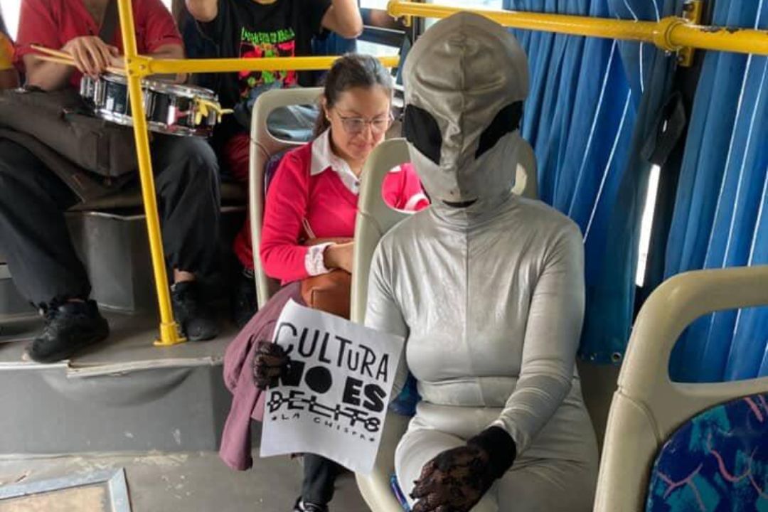 Una figura con estética de extraterrestre recorrió Asunción con un mensaje directo: “Cultura no es delito”. Primero frente al Palacio de Justicia, durante la presentación del recurso de casación, y luego en un colectivo, entre pasajeros y músicos, la escena irrumpió en lo cotidiano.