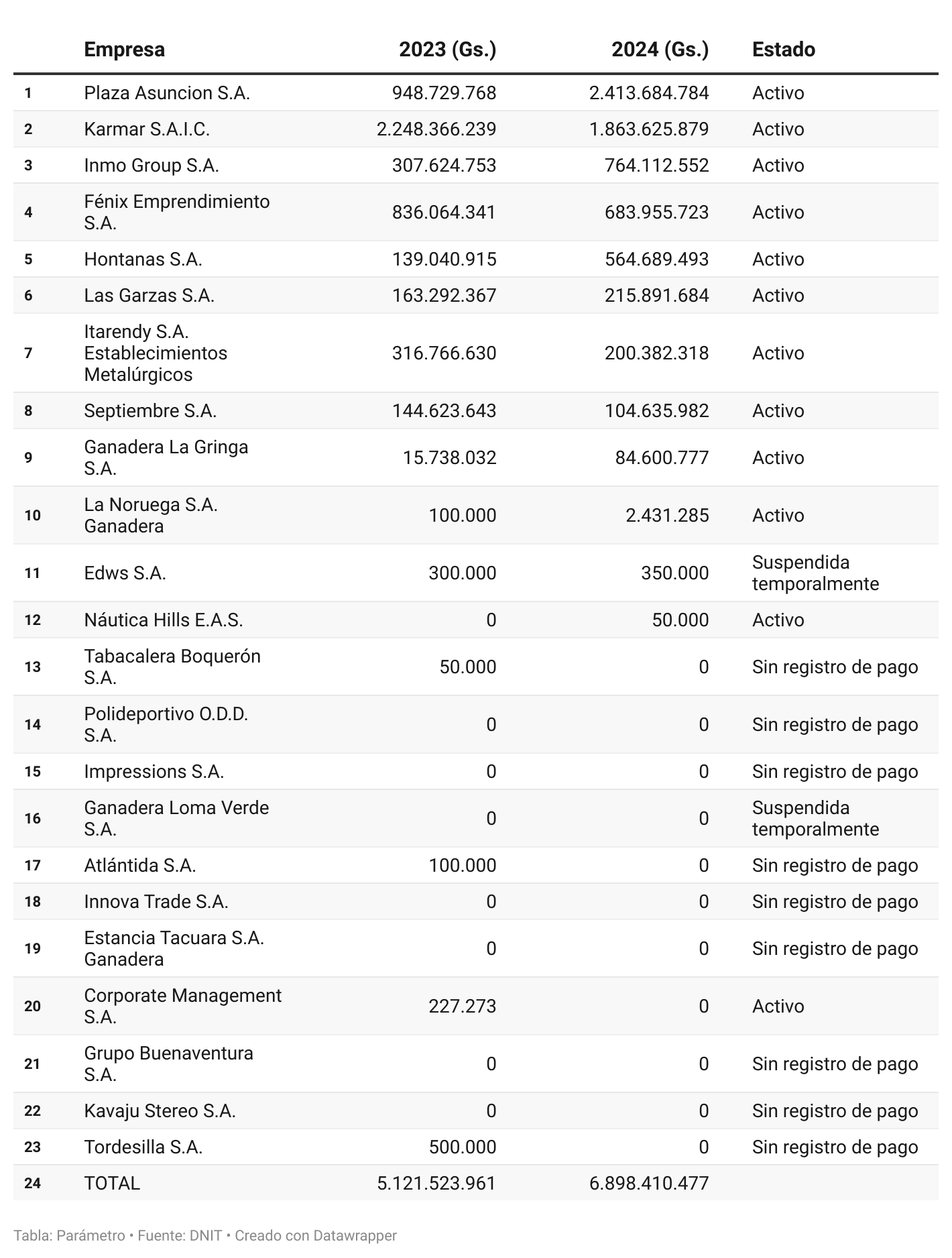 De las 23 sociedades registradas, once no declararon tributos en 2024: Grupo Buenaventura S.A., Innova Trade S.A., Impressions S.A., Estancia Tacuara S.A. Ganadera, Tordesilla S.A., Polideportivo O.D.D. S.A., Tabacalera Boquerón S.A., Atlántida S.A., Kavaju Stereo S.A., Corporate Management S.A. y Ganadera Loma Verde S.A., esta última registrada como suspendida temporalmente.