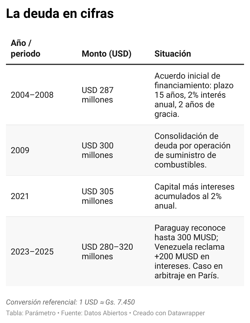 Paraguay reconoce unos USD 280–300 millones como capital adeudado, pero rechaza los intereses moratorios reclamados por Venezuela. Si prosperan esos reclamos, el total podría superar los USD 500 millones (≈ Gs. 3,725 billones), duplicando prácticamente el capital original.