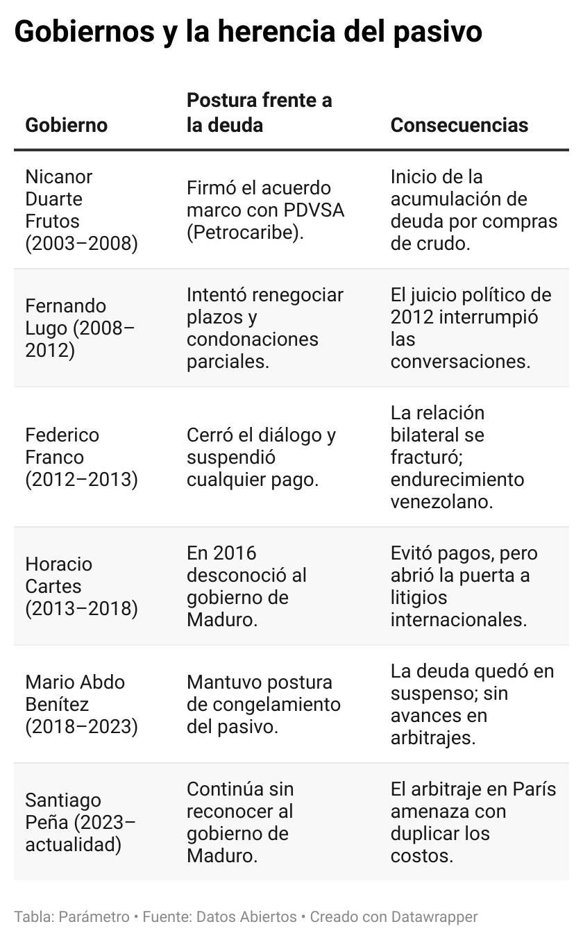 Más de cinco gobiernos y casi dos décadas después del acuerdo con PDVSA, Paraguay sigue sin resolver una deuda que hoy ronda los USD 300 millones (≈ Gs. 2,235 billones). El pasivo se originó en el esquema Petrocaribe de 2008 y se consolidó en 2009 con la compra de combustibles financiados. Desde entonces, ningún gobierno asumió el pago: todos optaron por congelar el conflicto, mientras los intereses siguieron corriendo.
