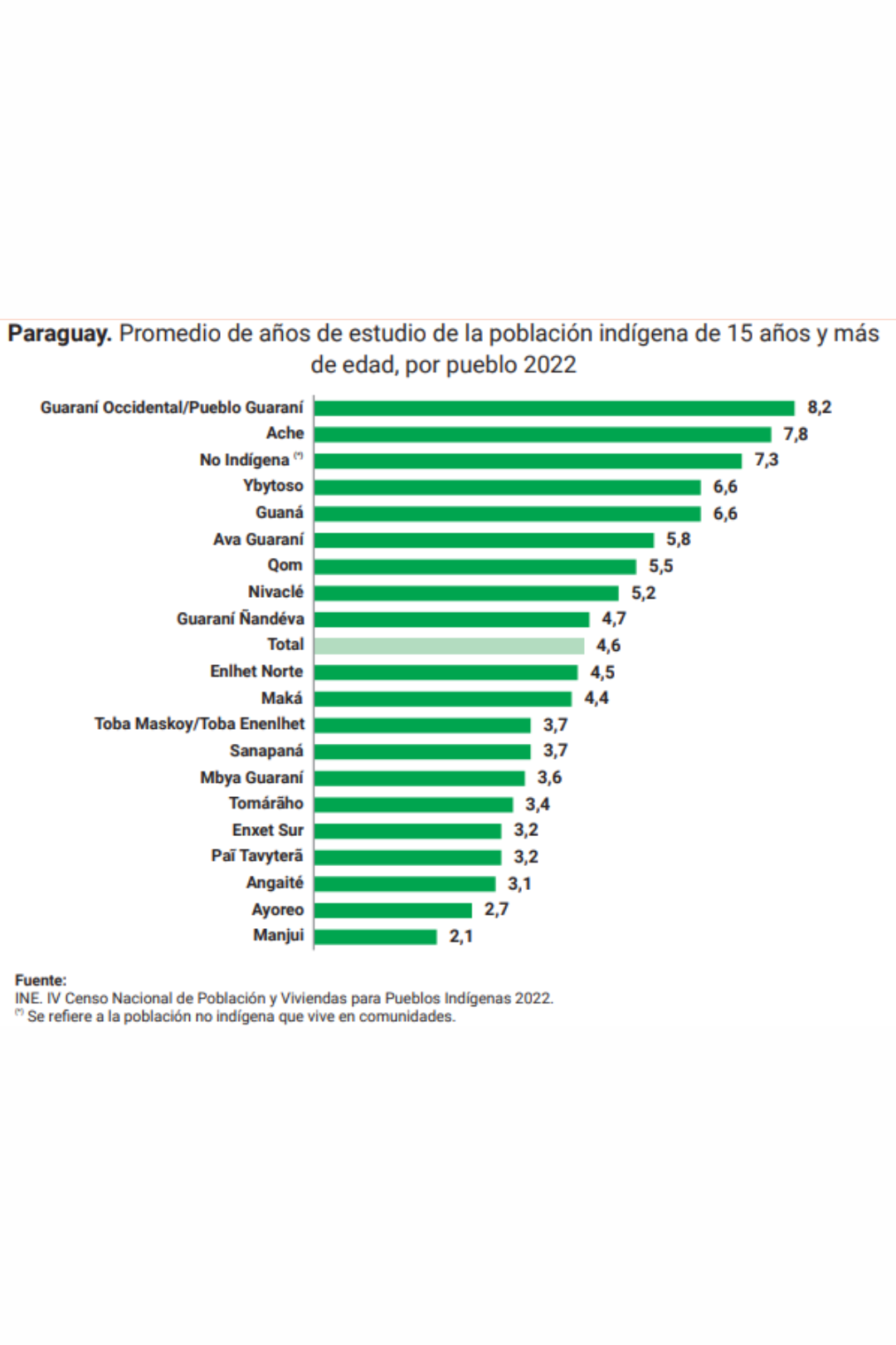 La escolaridad promedio es de apenas 4,6 años. Hay pueblos como los Guaraní Occidental que llegan a 8 años de estudio, pero otros como los Manjui apenas alcanzan 2.