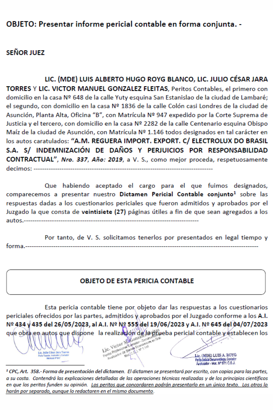 En julio de 2023, se presentó un Dictamen Pericial Contable que revisó libros, declaraciones fiscales y facturas de AM Reguera. El informe determinó que entre 2015 y 2017 la empresa vendió productos Electrolux por más de USD 50,5 millones, con una utilidad bruta anual promedio de USD 5,86 millones y una rentabilidad de 34,8%. También verificó importaciones por USD 52,7 millones y reportó un inventario en 2019 de G. 12.047 millones, aunque sin verificación física.