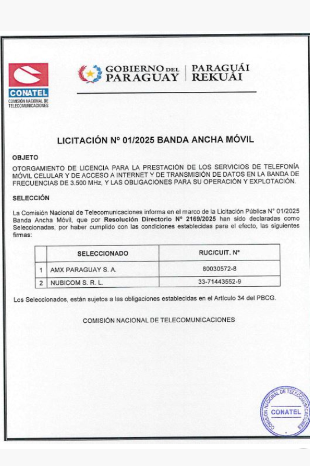En agosto de 2025, CONATEL adjudicó la banda de 3.500 MHz para el 5G, en un concurso que terminó dejando fuera a los grandes operadores Tigo y Personal por requisitos que limitaban proveedores de origen chino. Solo se presentaron Claro y la empresa argentina Nubicom.