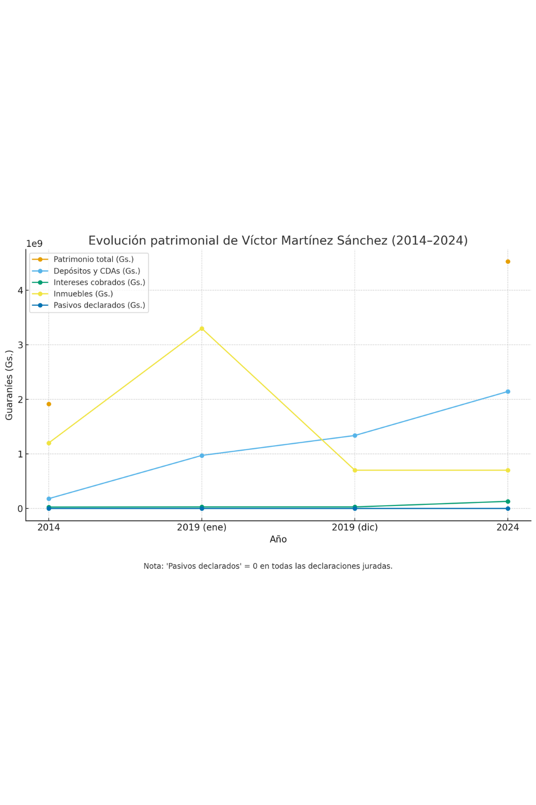 La mayor inconsistencia se observa en 2019. En enero declaró G. 3.300 millones (USD 478.000) en inmuebles; en diciembre, apenas G. 700 millones (USD 101.000). Desde entonces solo figura un inmueble con ese valor. No se detallan ventas ni transferencias, lo que deja abierta la pregunta sobre el destino de los bienes que justificaban esos tres mil millones iniciales.