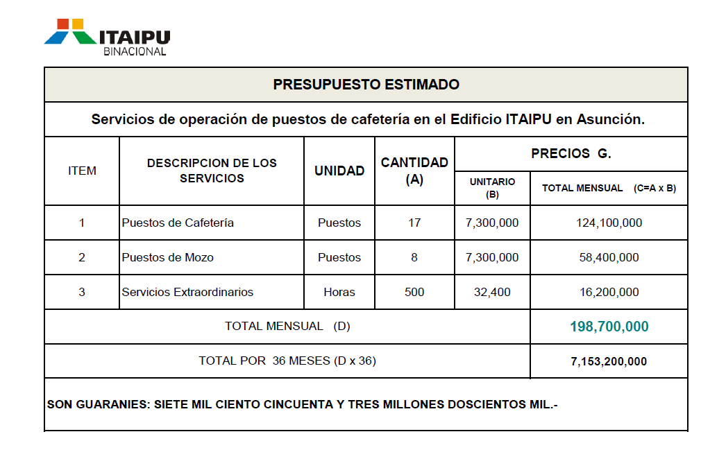 Itaipú Binacional, bajo la presidencia paraguaya de Justo Zacarías Irún, prevé un llamado a licitación el 29 de octubre de 2025 para contratar un servicio de cafetería en su sede de Asunción. El monto proyectado es de G. 7.153 millones, casi USD 1 millón, para cubrir 36 meses de un servicio que incluye desde mozos hasta seguros privados, en una muestra más del lujo institucional.