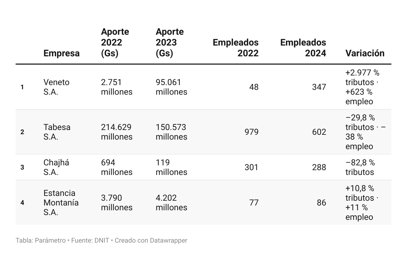 Las pérdidas de Tabesa y Frigorífico Chajhá, estimadas en G. 64.630 millones (USD 8,6 millones) entre 2021 y 2023, fueron compensadas por el crecimiento de Veneto S.A., que multiplicó por 34 su aporte fiscal en el mismo periodo.