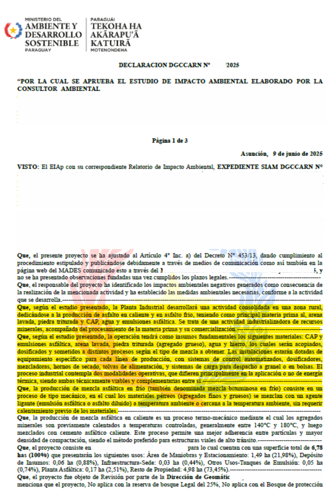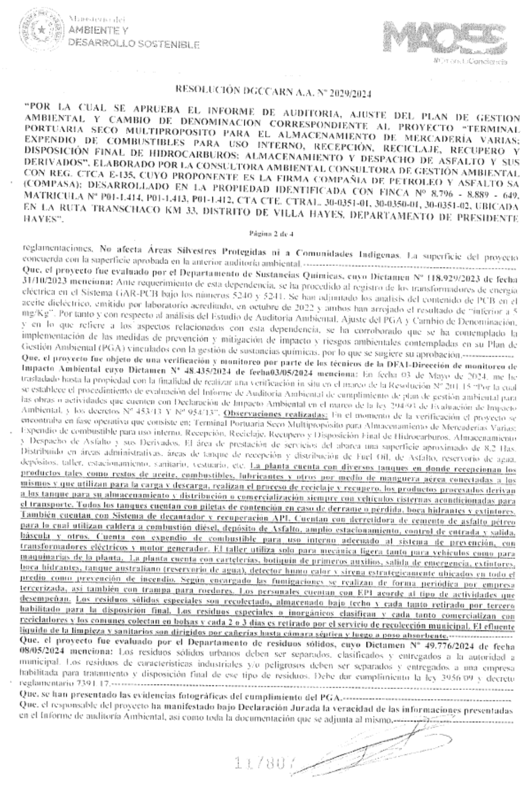 El MIC se basó en la Resolución N.º 2029/2024 del MADES, que aprueba un ajuste del plan de gestión ambiental de una terminal portuaria seca multipropósito. El documento menciona operaciones de almacenamiento, reciclaje y despacho de hidrocarburos, pero no la fabricación o mezcla asfáltica, ni el uso de maquinaria o personal técnico.