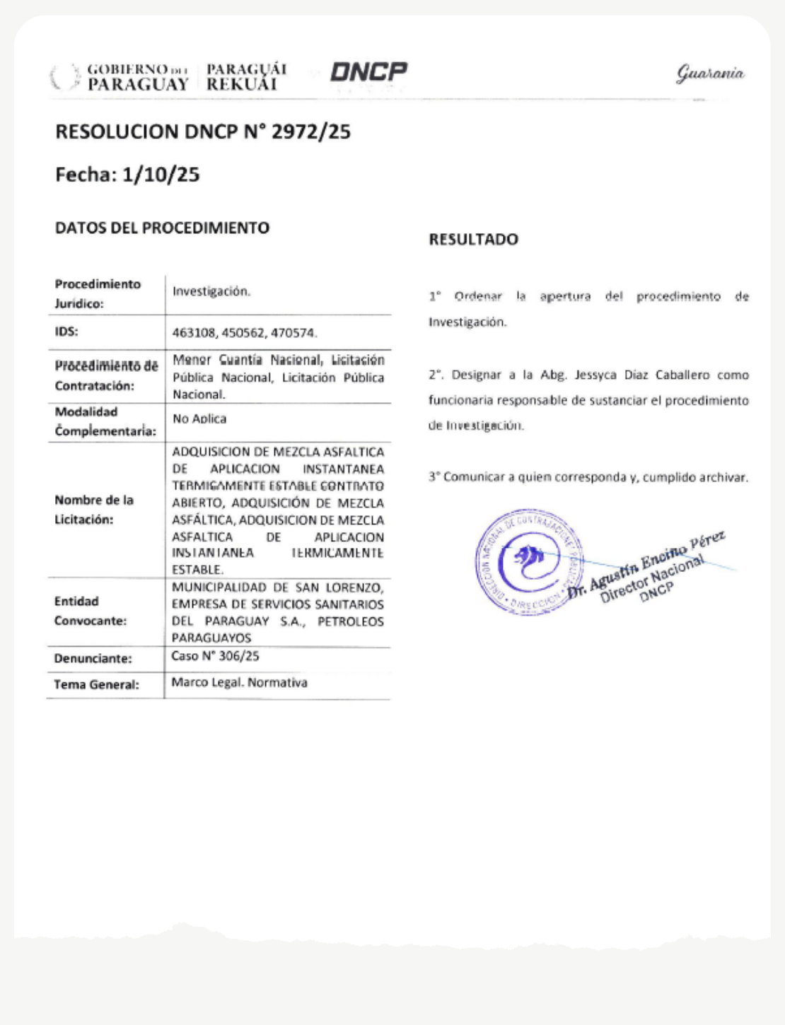 Según el expediente, el MIC emitió el Certificado de Producto y Empleo Nacional (CPEN) para COMPASA apoyándose en una resolución ambiental del MADES, que no describiría ninguna planta asfáltica. Con ese certificado, la empresa obtuvo el margen preferencial en tres licitaciones, entre ellas la N.º 4505/34 de Petropar, actualmente impugnada por una protesta que cuestiona el supuesto certificado de origen nacional presentado. El caso plantea además que el MIC habría intentado trasladar su responsabilidad legal, verificar existencia de planta y proceso productivo a otra institución que no tiene competencia técnica para hacerlo.