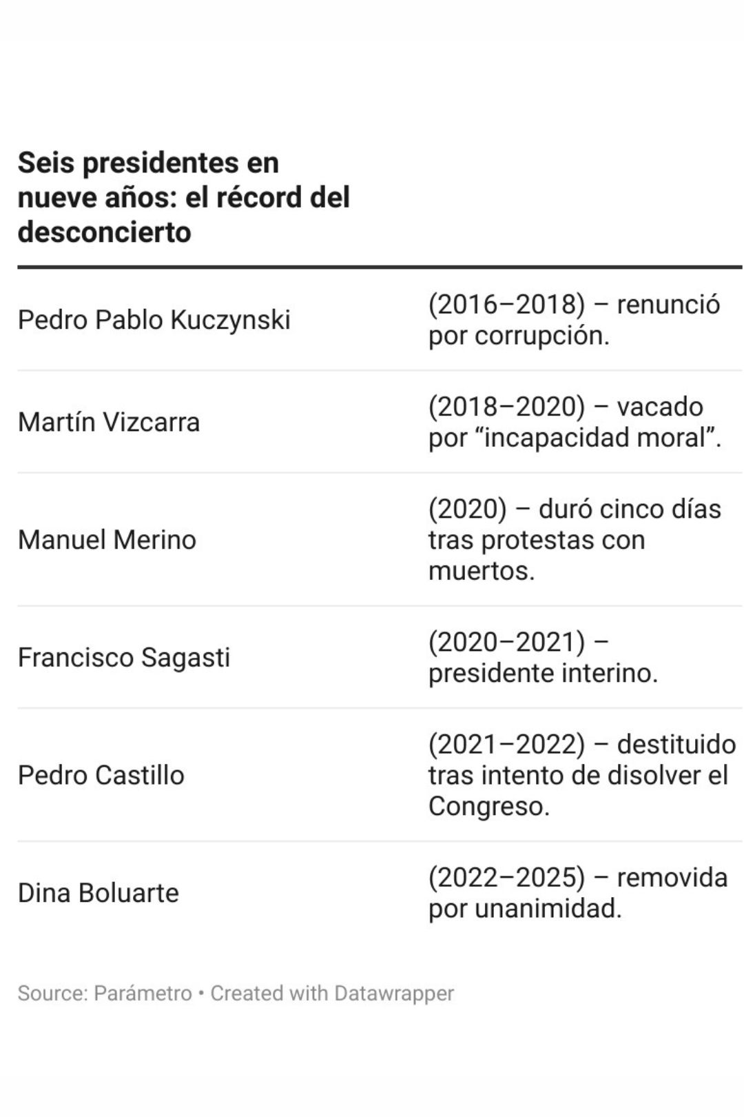 Lo inusual de esta secuencia no es solo la frecuencia de las destituciones, sino su normalización. La herramienta de vacancia por “incapacidad moral permanente”, pensada como un mecanismo excepcional, se transformó en un arma política cotidiana. Ningún otro país en América Latina ha experimentado un patrón tan persistente de inestabilidad presidencial en democracia.