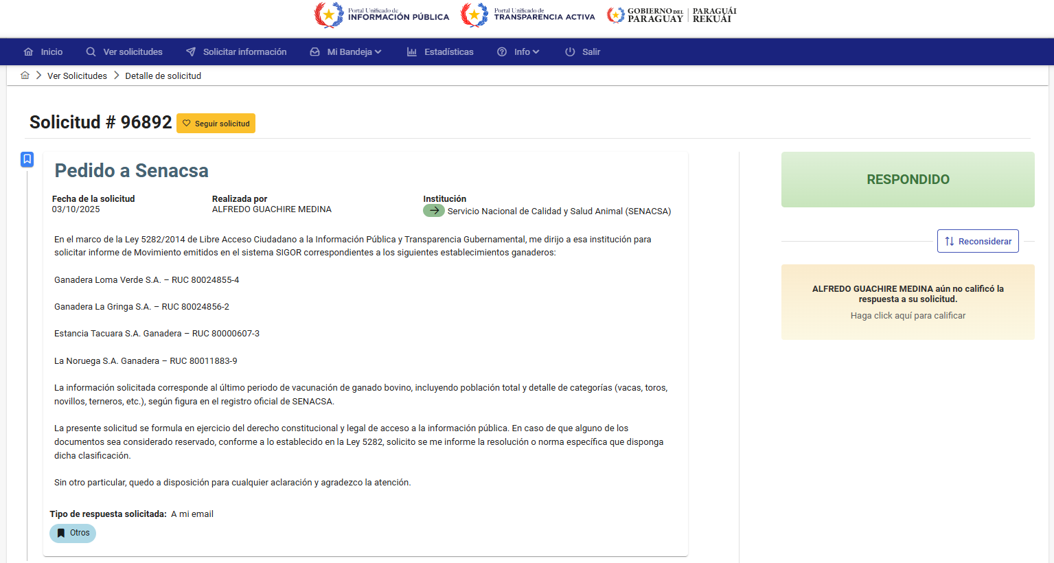 El pedido de acceso a los registros fue realizado a través del Portal Unificado de Transparencia y respondido por SENACSA con una resolución firmada por el Dr. José Carlos Martin Camperchioli, presidente de la institución. En su dictamen, la asesoría jurídica del organismo sostuvo que los datos del SIGOR “afectan el derecho a la inviolabilidad del patrimonio documental privado”.