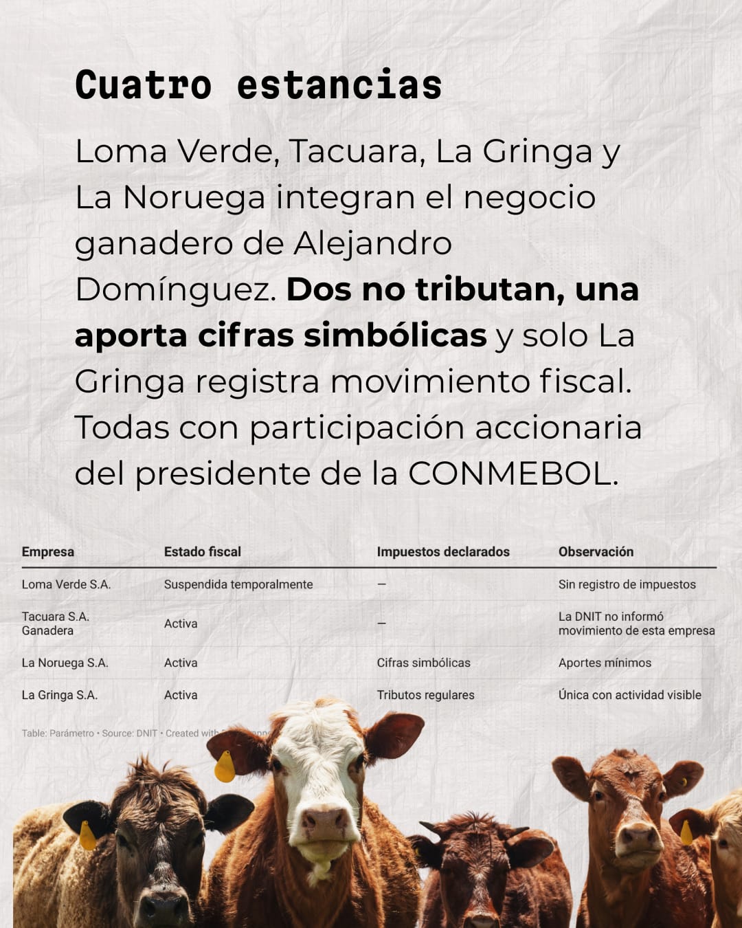 El rubro ganadero de Alejandro Domínguez, presidente de la CONMEBOL, opera bajo un esquema de discreción fiscal y silencio institucional. Cuatro empresas rurales conforman su estructura: Ganadera Loma Verde S.A., Estancia Tacuara S.A., Ganadera La Gringa S.A. y La Noruega S.A.. De ellas, dos no registran impuestos en la DNIT, una presenta cifras simbólicas y solo La Gringa muestra movimiento real. Pese a la relevancia económica del grupo, la Servicio Nacional de Calidad y Sanidad Animal (SENACSA) decidió negar el acceso a los datos del sistema SIGOR, donde constan los registros de vacunación, stock y traslado de animales, impidiendo conocer la magnitud de su producción. El argumento oficial: “protección de datos privados”.