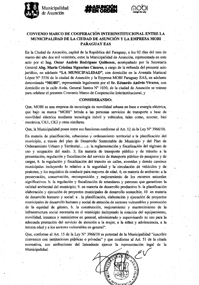 Convenio firmado entre la Municipalidad de Asunción y MOBI Paraguay EAS, que limita la zona piloto de implementación a cuatro barrios: Villa Morra, Las Lomas, Recoleta y Las Mercedes.