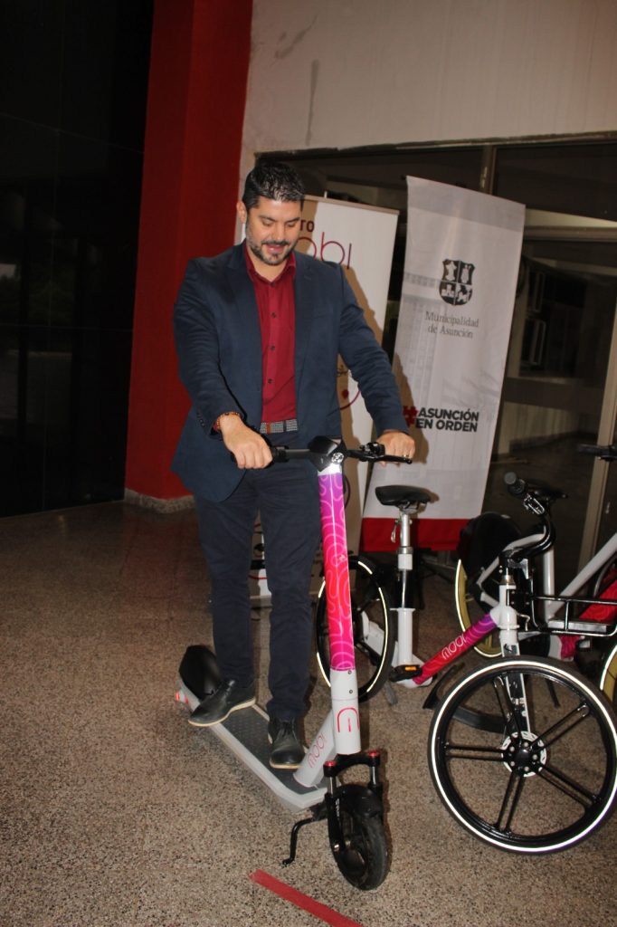 En la imagen se observa al exintendente Óscar “Nenecho” Rodríguez durante la presentación y firma del convenio con MOBI Paraguay, junto a un monopatín eléctrico que luego nunca volvió a aparecer.