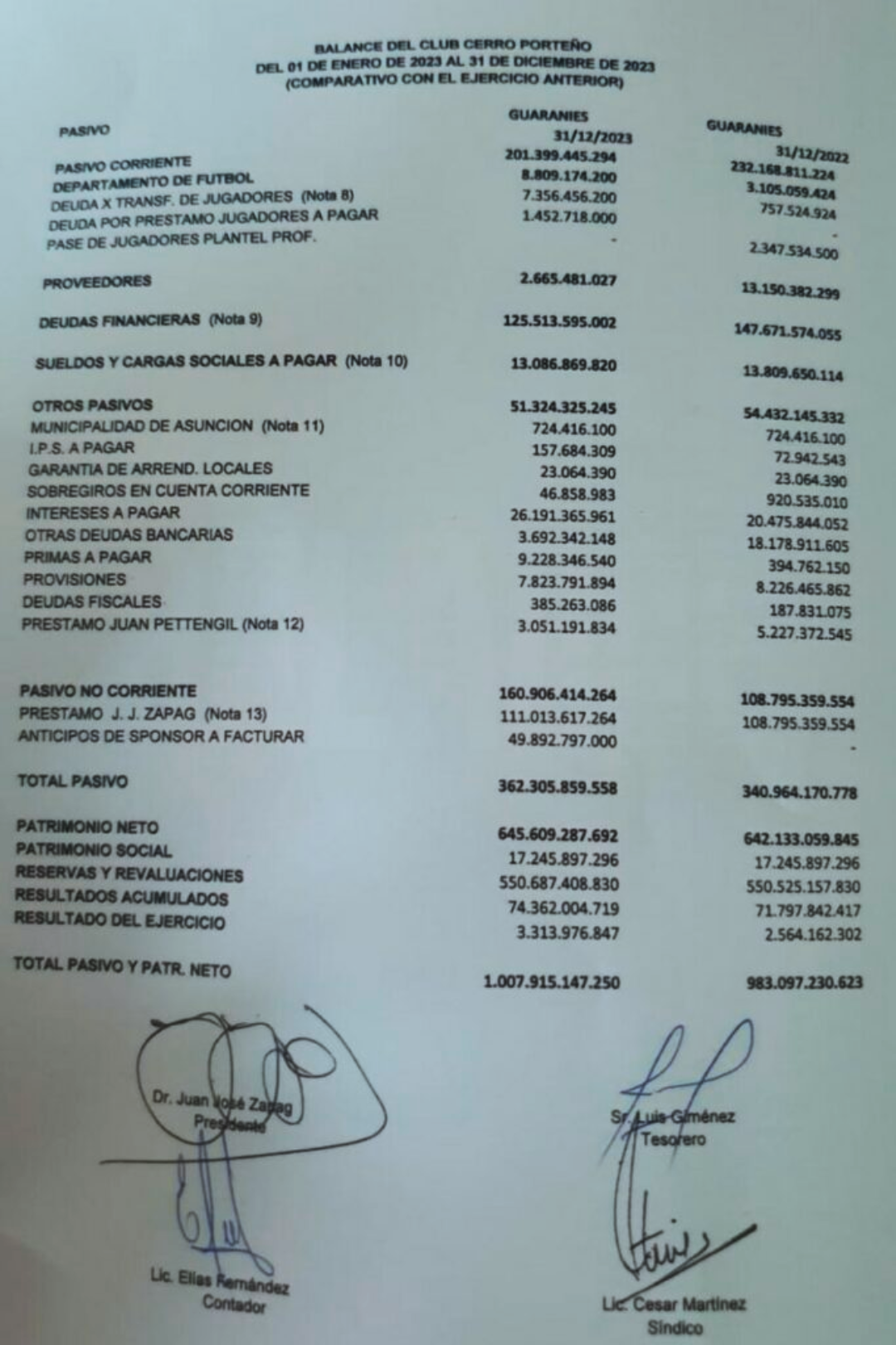 Balance general del Club Cerro Porteño – Ejercicio cerrado al 31 de diciembre de 2023.